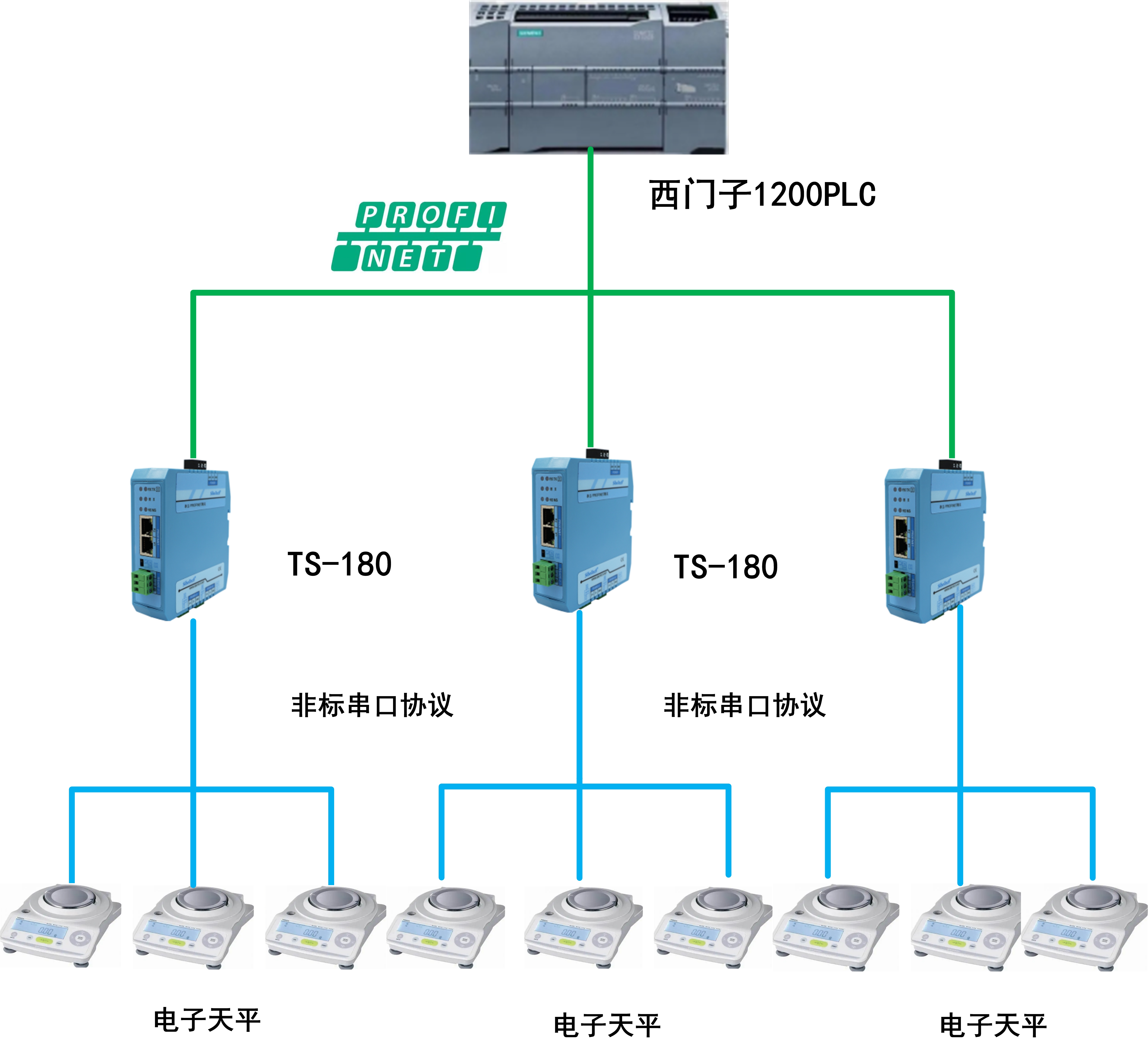 该实验室中智能数据分析系统使用西门子1200 PLC,以太网口支持PROFINET协议,但所采购的电子天平其对外提供的通信接口为RS232(非标串口协议)。为了实现PLC与电子天平快速、稳定、可靠通信,确保实验数据的实时性和准确性,客户选择上海泗博公司—串口转PROFINET网关TS-180作为该通信的解决方案。