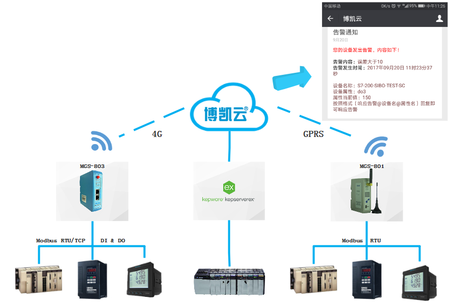 若现场没有KEPServerEX,通过泗博的物联网网关MGS-801/MGS-803也可实现将Modbus/Modbus TCP/DI&DO 的PLC数据上到博凯云,免费获取关键数据的相关报警通知。