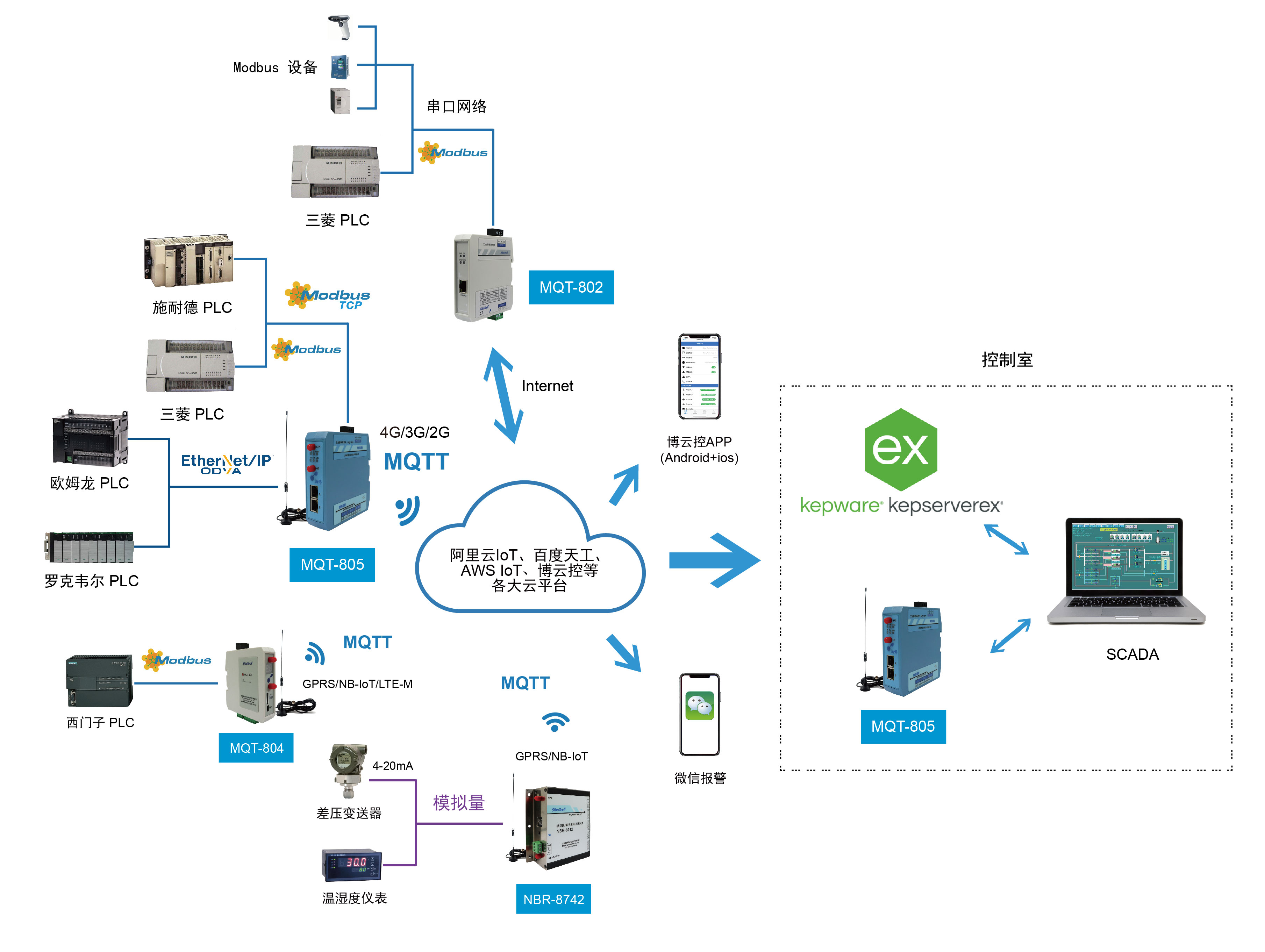 远程现场通过使用泗博自动化的物联网网关(MQT-805、MQT-804、NBR-8742),分别对现场的各种PLC (AB、欧姆龙、施耐德、台达等品牌)或模拟量设备(智能仪表)的参数、数据进行采集,泗博物联网网关的无线端基于MQTT协议通过4G/NB-IOT网络 将采集的数据发布至MQTT broker(阿里云IOT、EMQ等)。中控室部署的MQT-805通过订阅MQTT broker的相关数据并转换成 Modbus TCP 信号传送到中控室的 SCADA 软件,由SCADA对数据进行统一化处理、存储和分析。中控室SCADA软件通过无线方式和远程现场的各种仪器、仪表、PLC等设备的快速联接,实现设备状态、参数、故障等信息的远程监控管理。设备“速联”的同时,亦可随时通过博云控APP、微信移动端查看数据。