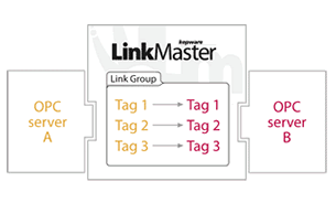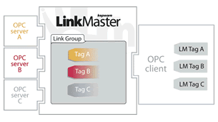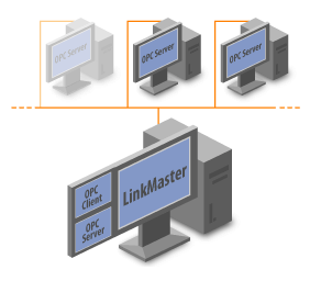 Another interesting application scenario for LinkMaster is to function as a single OPC server which serves data from multiple OPC servers. This approach demonstrates LinkMaster's capability of acting as both a client and server. An example might be when a customer has a single OPC connection available from an OPC client application but multiple OPC servers that they want to acquire data from.