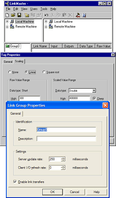 Link Groups are used to form collections of OPC items that will be moved between OPC servers at a specified rate. Using multiple Link Groups, LinkMaster allows you to control how fast data is transferred from one OPC server to another. By using Link Groups with different update rates you can tailor your data transfers to fit the needs of the application. While one item may need to be sent at high speed, other items in the application may need slower update rates. Link Groups gives you that control. The benefit is reduced network traffic and increased reliability