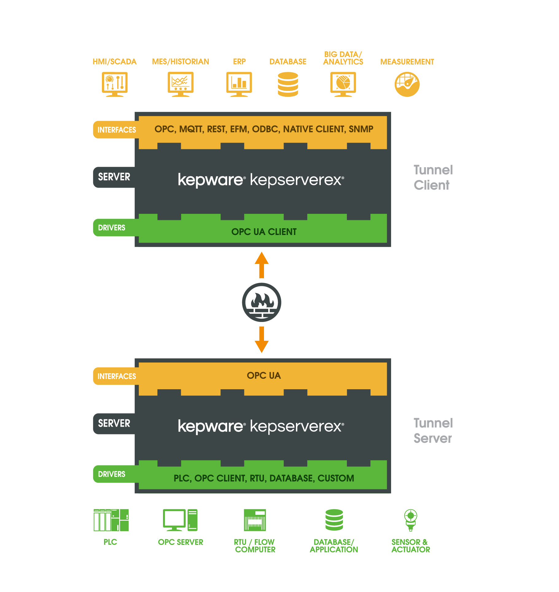 Kepware 的 OPC 隧道通讯方案包含 KEPServerEX 连接平台和 OPC UA Client 驱动。OPC UA 统一架构开放标准用于为 KEPServerEX 两个实例之间的设备通信提供理想隧道:一个实例用作隧道客户端,另一实例用作隧道服务器。OPC UA Client 驱动与 KEPServerEX 实施的 UA 服务器接口配对以安全可靠地传输数据。