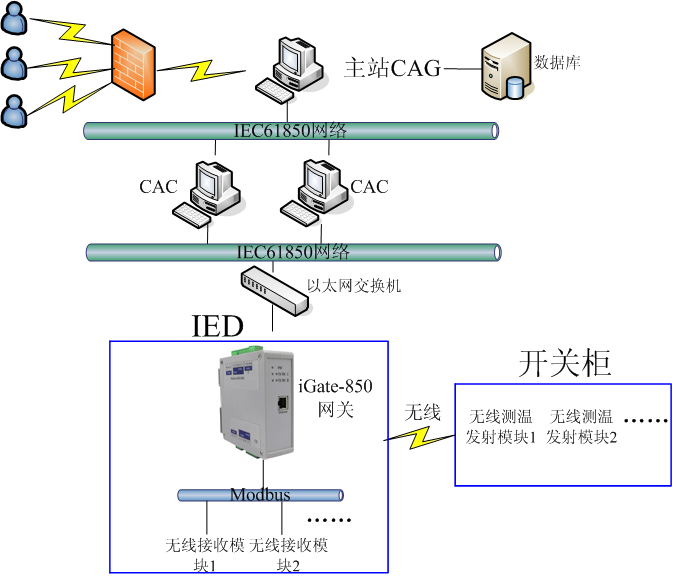 该应用现场位于温州,采用CAG(状态接入网关)通过CAC(状态接入控制器)对下层的设备及IED(智能电子设备)进行在线监控、下发定值命令、召唤历史数据、读取遥测遥信数据等,IED中具有传感器模块、协议转换模块、存储模块、操作系统、故障代码生成等功能。 |