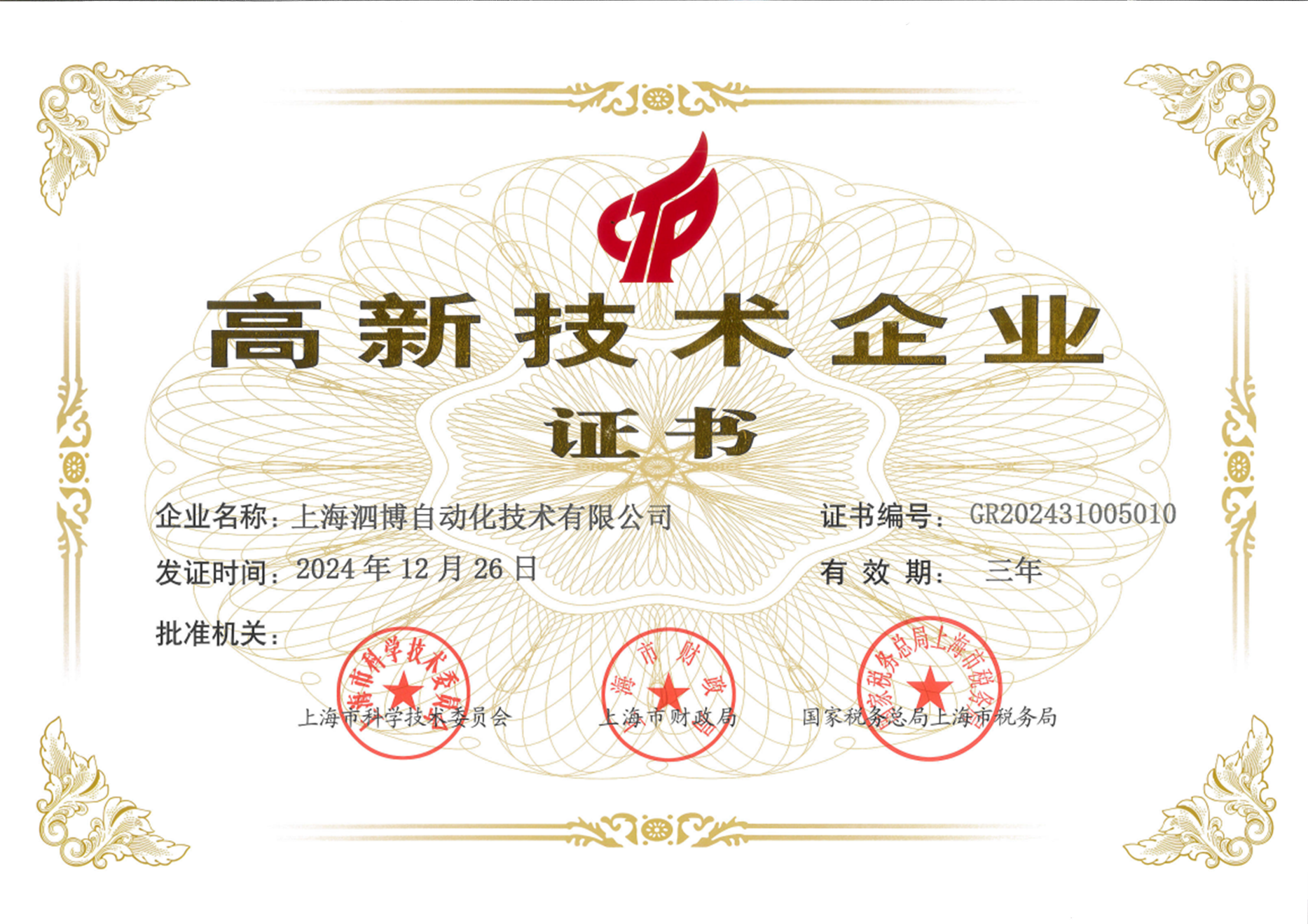 高新技术企业证书
