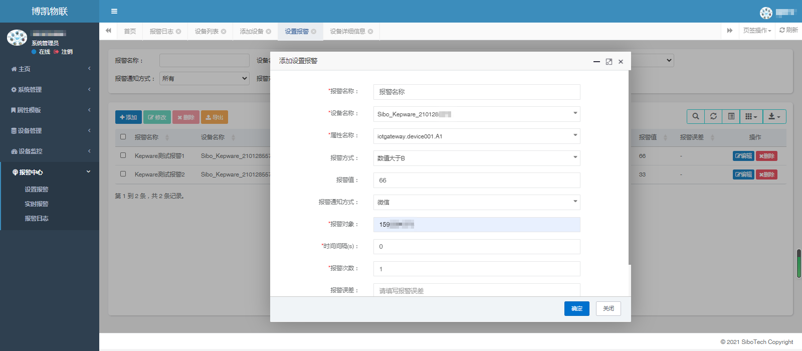 新增报警设置,选择新增的设备和属性信息,补充完善报警设置的相关信息,报警方式选择“微信”类型。