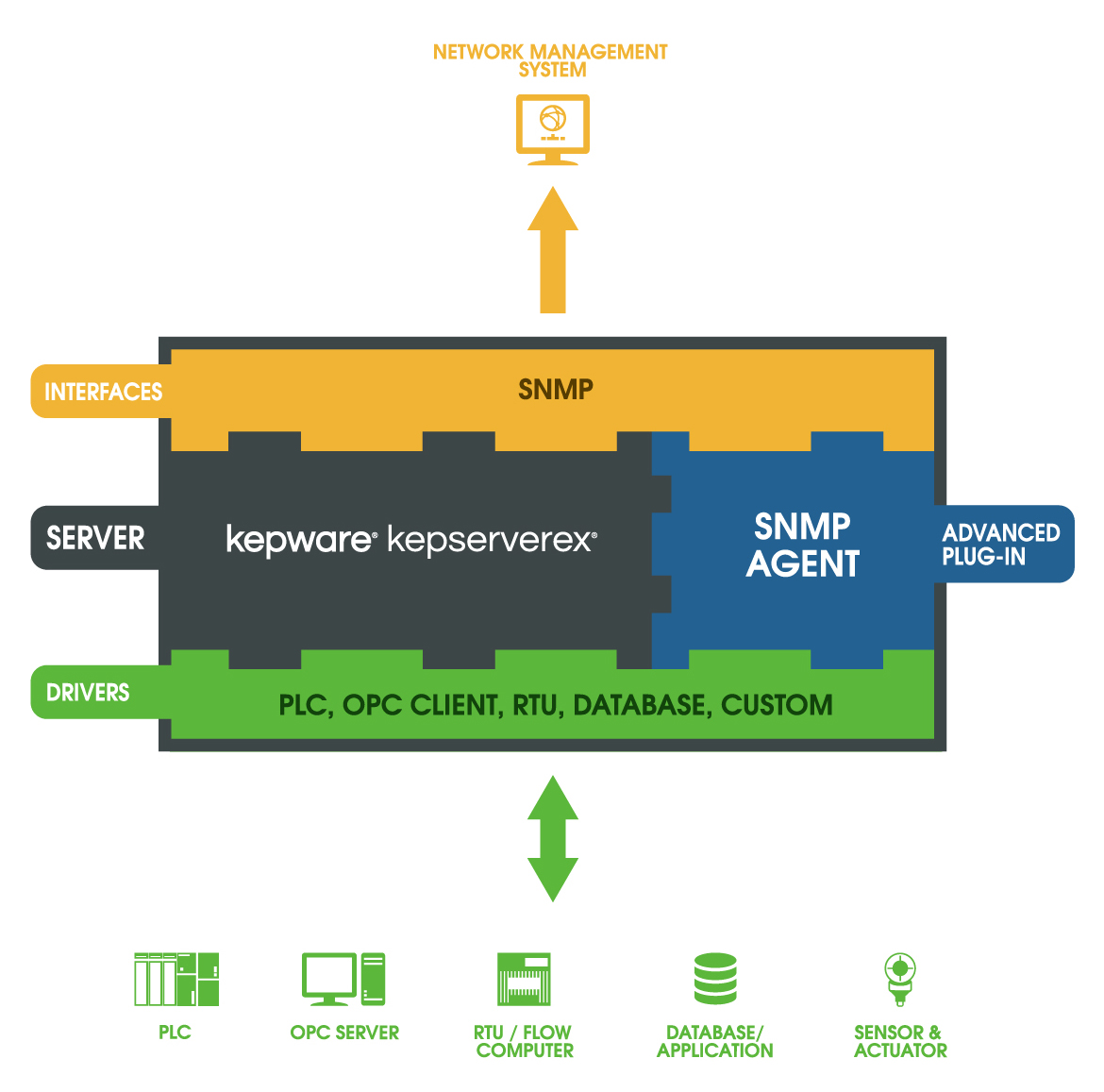 SNMP Agent for KEPServerEX 为 IT 专业人员提供一个易于使用的软件平台来访问自动化系统和设备。这是专为建筑自动化、石油和天然气、IT 和基础设施、电力和公共事业以及供水和污水处理等工业应用构建的一个拥有 150 多个通信驱动的应用程序。SNMP Agent 使大多数 NMS 能够与自动化设备和自动化系统通信。